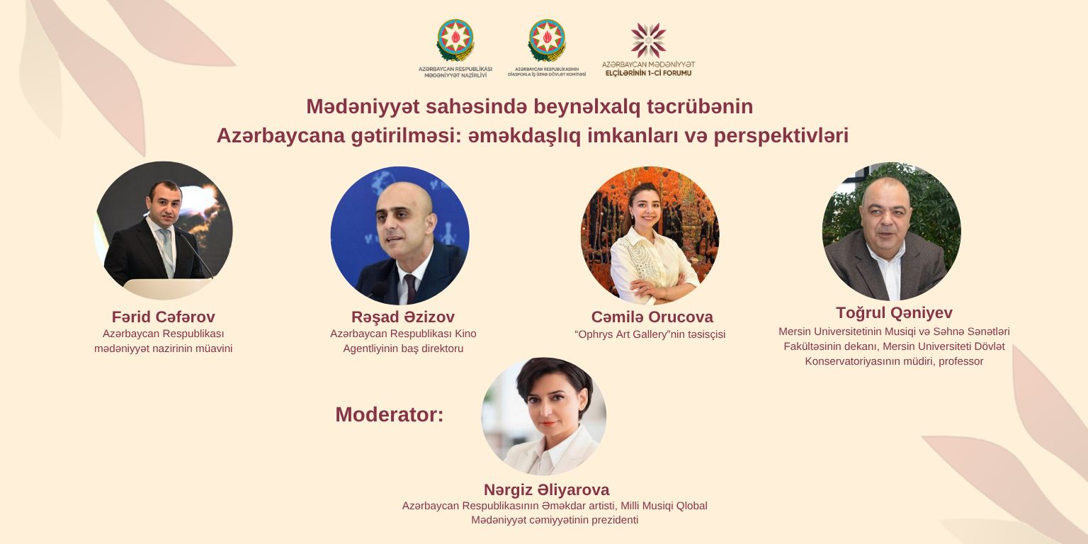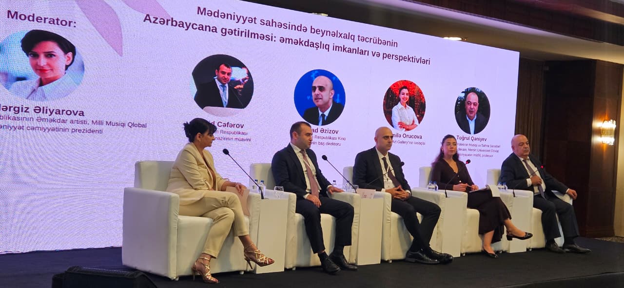 “Mədəniyyət sahəsində beynəlxalq təcrübənin Azərbaycana gətirilməsi: əməkdaşlıq imkanları və perspektivlər” mövzusuna həsr olunan paneldə Azərbaycan mədəniyyətinin inkişafında beynəlxalq əməkdaşlıq imkanlarının genişləndirilməsi, qabaqcıl təcrübələrin öyrənilməsi və tətbiqi istiqamətində yeni yanaşmalar müzakirə olunub. Əməkdar artist, Milli Musiqi Qlobal Mədəniyyət Cəmiyyətinin prezidenti Nərgiz Əliyarovanın moderatorluğunda keçən panelin çıxışçıları mədəniyyət nazirinin müavini Fərid Cəfərov, Kino Agentliyinin baş direktoru Rəşad Əzizov, “Ophrys Art Gallery”nin təsisçisi Cəmilə Orucova, Mersin Universitetinin Musiqi və Səhnə Sənətləri Fakültəsinin dekanı, Mersin Universiteti Dövlət Konservatoriyasının müdiri, professor Toğrul Qəniyev olub. Qloballaşma şəraitində mədəniyyətlərarası dialoqun gücləndirilməsinin və beynəlxalq təcrübənin yerli mühitə uyğunlaşdırılmasının Azərbaycanın mədəni siyasətinin prioritet istiqamətlərindən olduğu qeyd edilib. Panel zamanı həmçinin ortaq layihələrin həyata keçirilməsi, gənc mədəniyyət mütəxəssislərinin beynəlxalq təcrübə proqramlarına cəlb olunması, mədəni diplomatiyanın gücləndirilməsi kimi məsələlər müzakirə edilib.