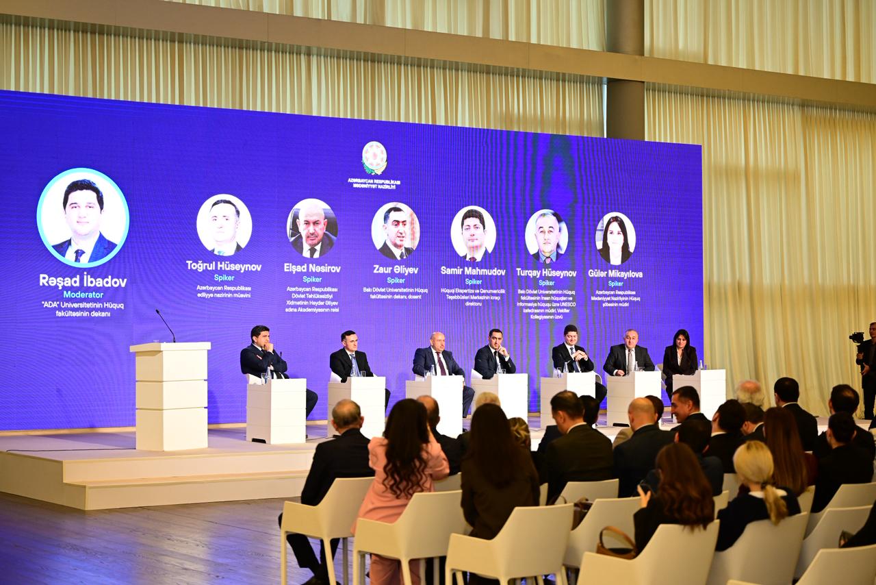 Azərbaycan Respublikası ədliyyə nazirinin müavini Toğrul Hüseynov, Dövlət Təhlükəsizliyi Xidmətinin Heydər Əliyev adına Akademiyasının rəisi Elşad Nəsirov, Bakı Dövlət Universiteti (BDU) Hüquq fakültəsinin İnsan hüquqları və informasiya hüququ üzrə UNESCO kafedrasının müdiri Turqay Hüseynov, BDU-nun Hüquq fakültəsinin dekanı Zaur Əliyev, Hüquqi Ekspertiza və Qanunvericilik Təşəbbüsləri Mərkəzinin icraşı direktoru Samir Mahmudov və Mədəniyyət Nazirliyi Hüquq şöbəsinin müdiri Gülər Mikayılova çıxış ediblər.