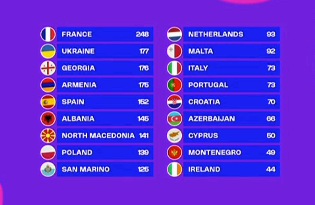 İlk beşlikdə ardıcıl olaraq Ukrayna, Gürcüstan, Ermənistan və İspaniya yer alıb.