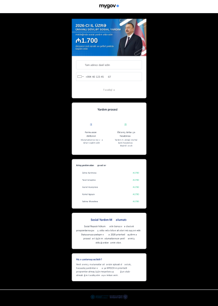 Son günlərdə fişinq xarakterli müxtəlif saxta domenlər yaradılaraq sosial şəbəkələr və ani mesajlaşma tətbiqləri vasitəsilə əhali arasında dövlət tərəfindən ünvanlı sosial yardımların verilməsi ilə bağlı dezinformasiya yayılmaqdadır. Xüsusilə Azərbaycan Respublikasının Rəqəmsal İnkişaf və Nəqliyyat Nazirliyinin və tabeliyində fəaliyyət göstərən İnnovasiya və Rəqəmsal İnkişaf Agentliyi PHŞ-ə məxsus “myGov” portalının adından istifadə olunmaqla saxtalaşdırılmış saytlar yaradılaraq vətəndaşların fərdi məlumatlarının ələ keçirilməsi hədəflənir.