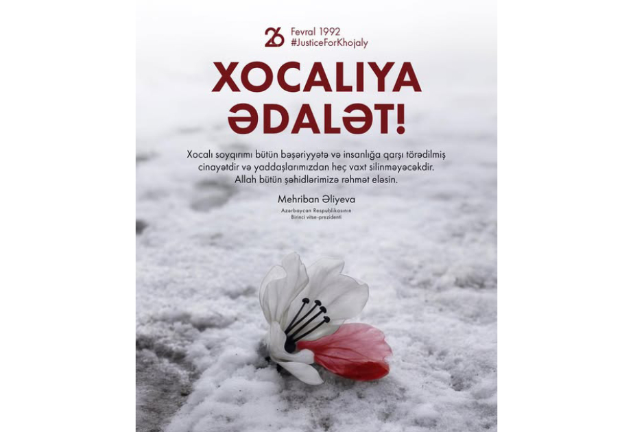 Azərbaycan Respublikasının Birinci vitse-prezidenti Mehriban Əliyeva Xocalı soyqırımının 34-cü ildönümü ilə bağlı sosial şəbəkə hesablarında paylaşım edib.